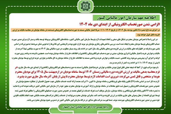 بر اساس بند (غ) تبصره ۱ قانون بودجه سال ۱۴۰۴، از این تاریخ صرفاً صورتحسابهای الکترونیکی ثبتشده در سامانه مؤدیان مبنای پذیرش اعتبار مالیاتی خواهند بود و مؤدیان باید از هماکنون نسبت به آمادگی کامل...