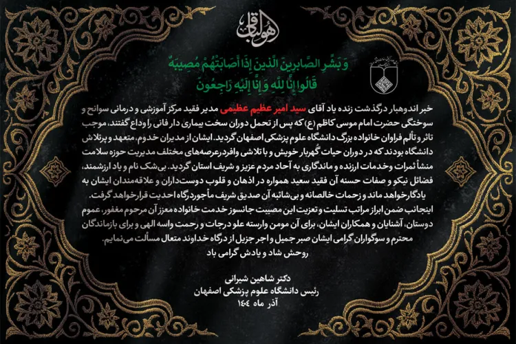 پیام تسلیت رییس دانشگاه در پی درگذشت مدیر فقید مرکز آموزشی درمانی سوانح و سوختگی حضرت امام موسی کاظم (ع)