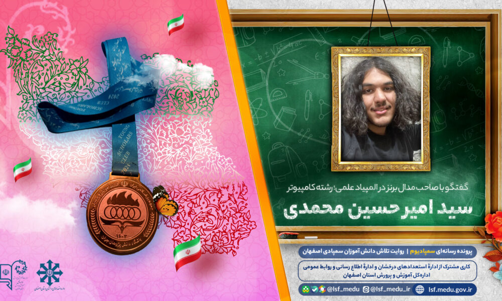 -: بنده سید امیرحسین محمدی هستم؛ دانش آموز دوازدهم رشته ریاضی دبیرستان شهید اژه ای ۱ اصفهان و با شرکت در المپیاد کشوری رشته کامپیوتر را انتخاب کرده و مدال برنز این سری از رقابت های علمی را به دست آوردم.