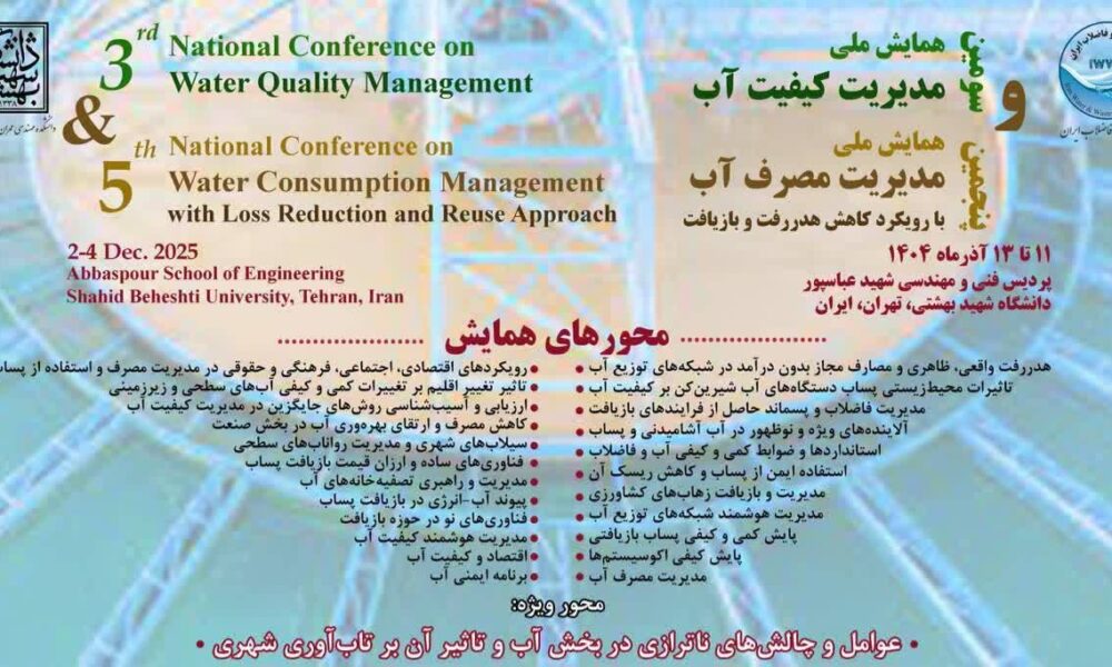 شایان ذکر است، سومین همایش ملی مدیریت کیفیت آب و پنجمین همایش ملی مدیریت مصرف آب با رویکرد کاهش هدررفت و بازیافت توسط دانشگاه شهید بهشتی و انجمن آب و فاضلاب ایران در شهر تهران برگزار میشود.